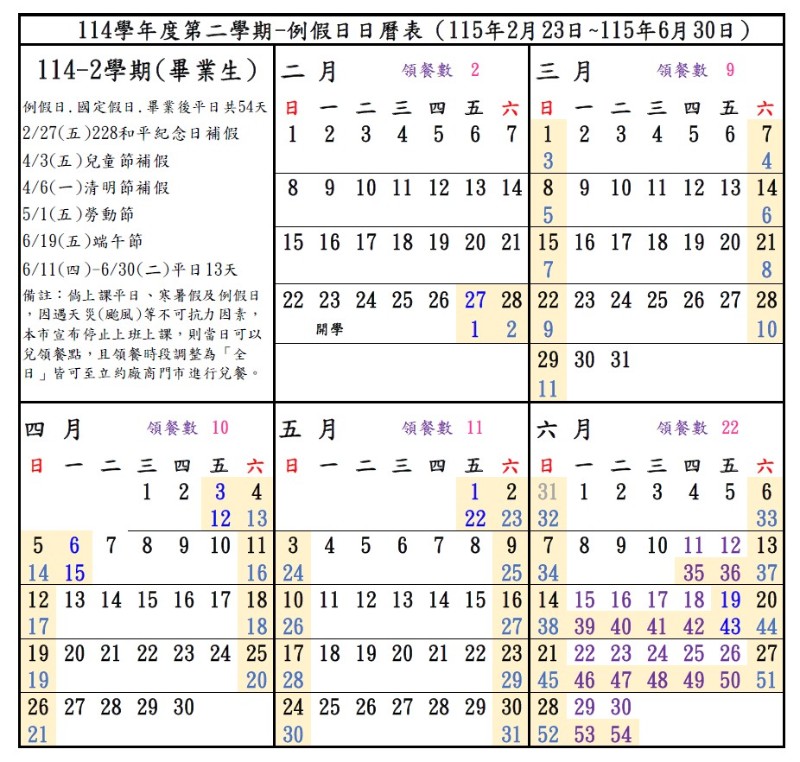 115年2月23日至115年6月30日(含6月11日畢業典禮當日-6月30日「平日部分」共13天),共計54天。