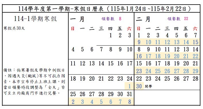 115年寒假暨114-2例假日 安心午餐券領餐內容