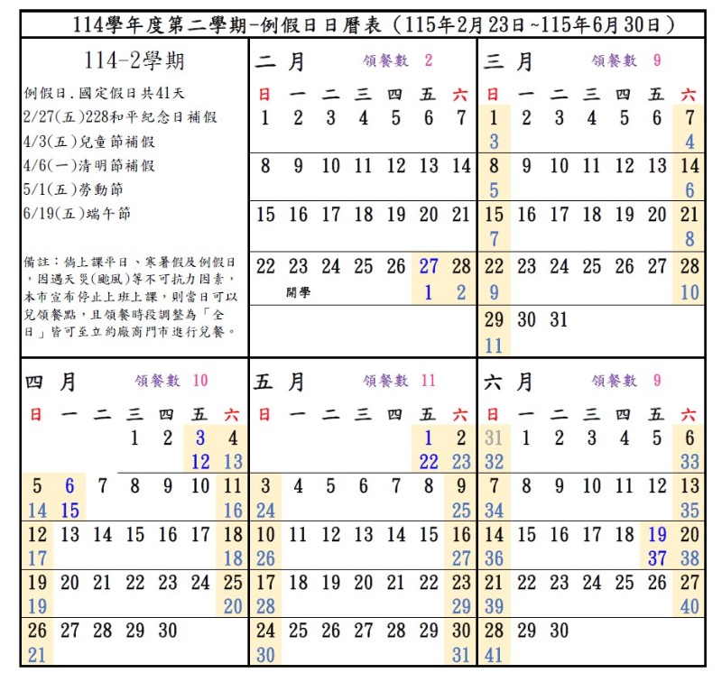 115年2月23日至115年6月30日(6月30日休業式),共計41天。