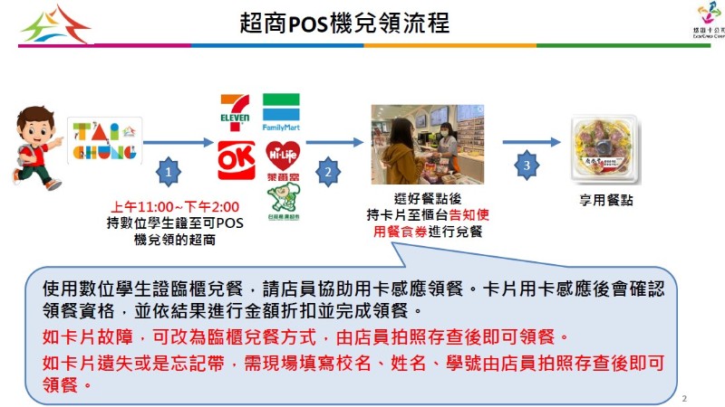 學生於臺中市以外之外縣市僅能憑「學生證實體卡」兌換餐食,不得以卡號、學號或臨櫃填寫方式辦理兌換。