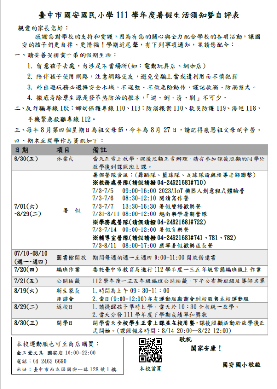| 標題 | 112年暑期生活注意事項(含教育部的一封信、臺中市暑假生活注意事項、反詐騙宣導、本校暑期生活須知) |