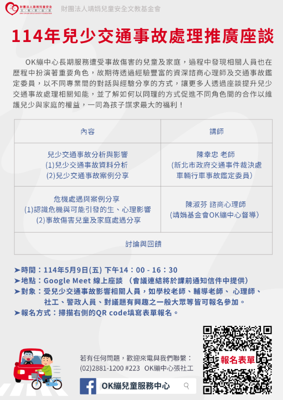 | 標題 | 轉知-財團法人靖娟兒童安全文教基金會OK繃兒童服務中心於114年5月9日(星期五)辦理「114年兒少交通事故處理推廣座談」- |