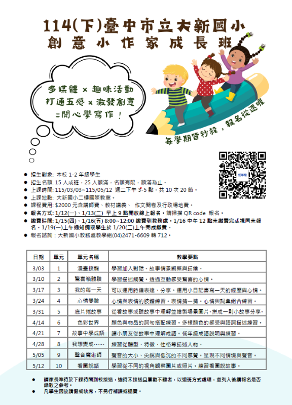 大新國小114學年度下學期低年級創意小作家成長班招生簡章