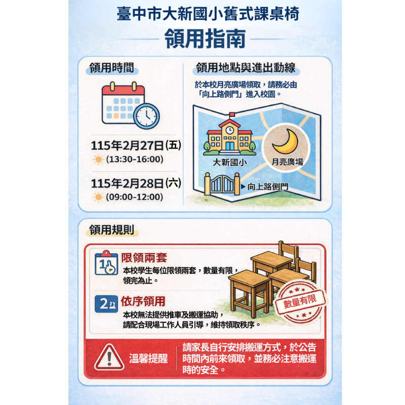 🟥 領用時間與地點 • 115年2月27日 (五) 13:30 - 16:00 • 115年2月28日 (六) 09:00 - 12:00 • 地點: 本校月亮廣場(請務必由向上路側門入校) 🟥 領用規則與配合事項 1. 限領兩套:本校學生每位限領兩套,數量有限,領完為止。 2. 依序領取:本校無法提供推車及搬運協助,請配合現場工作人員引導,維持領取秩序。 🟥【溫馨提醒】請家長自行安排搬運方式,於公告時間內前來領取,並務必注意搬運時的安全。