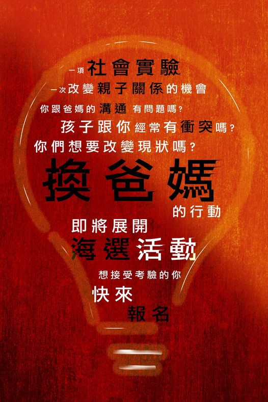 報名時間為2021年4月1日至2021年4月30日止。詳細內容及辦法請上臉書搜尋『換個爸媽過幾天』粉絲團。 |