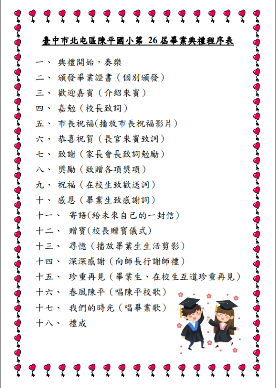 | 標題 | 謹訂於中華民國114年6月12日(星期四)上午9時00分,於本校地下活動中心舉辦第26屆畢業典禮,敬請家長及各界蒞臨指導 |
