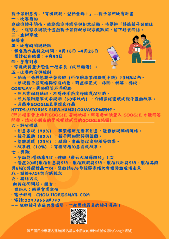五、比賽內容與規則 。拍攝一張靜態親子裝合照(可使用專業相機或手機)10MB以內。 。展現親子裝風格與家庭特色,可選擇正式、休閒、搞笑、傳統、Cosplay、民俗風等不同風格 。照片需保持清晰,不得使用過度修圖或AI生成。 。照片須附簡單文字說明(50字以內),介紹穿搭靈感或親子互動故事。 。透過本Google表單提交作品https://forms.gle/LHXmZ1oXVA9xpWeH9。 (照片檔案會上傳到Google 雲端硬碟。報名者必須登入 Google 才能回答問題。請以小朋友的學校帳號或您的Google帳號) 六、評分標準 。創意表現(40%):服裝搭配是否有創意,能否展現獨特風格。 。親子互動(30%):親子間的默契與氛圍。 。整體美感(20%):構圖、畫面整潔度與視覺效果。 。故事性(10%):穿搭背後的意義或故事。 七、獎勵: 。參加獎:優點章3枚,體驗「飛天大扭彈珠台」1次 。優選20組(最佳創意獎5組、最佳默契獎5組、最佳設計獎5組、最佳美感獎5組):優選禮品一份,暨邀請5/5母親節表揚大會授獎並現場走秀 八、請於4/25前完成報名 九、聯絡方式 如有任何問題,請洽: