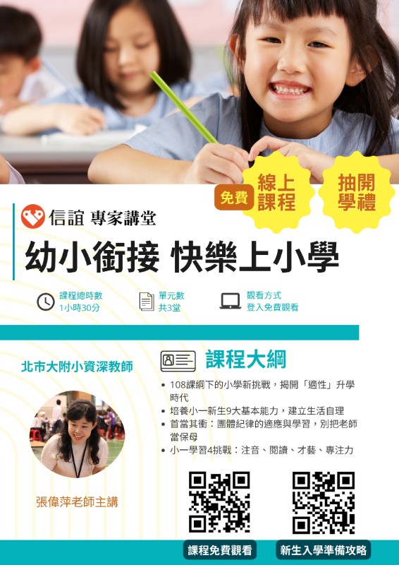 為幫助今年即將升小一的孩子順利銜接小學生活,信誼基金會提供線上課程「做好幼小銜接 快樂上小學」讓新生家長免費觀看,由北市大附小資深教師張偉萍主講,透過3堂課程帶爸媽認識小學世界,陪伴孩子上小學。三堂課主題如下: |