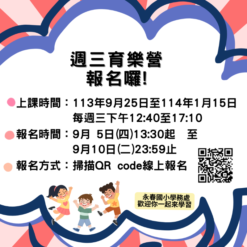 七、報名時間及方式: (一)請於本校首頁(https://yces.tc.edu.tw/),點選113學年度第1學期週三育樂營招生公告內點選報名網址https://www.beclass.com/rid=294d9ac66b9a45266ddf進行線上報名。亦可掃描QR code,直接使用智慧型手機線上報名。 (二)自113年9月5日(四)中午13:30起至113年9月10日(二)晚上11:59截止進行線上報名。請務必詳閱簡章及謹慎審視報名資料,期限內可自行上網更改。 9/13(五)16:00前於學校網頁公告錄取名單確定開班,請逕行前往查閱。 八、退費基準: (一)報名截止後視人數確定開班,確定開班當日於學校官網公告錄取名單。於確定開班日前申請退費者,退還所繳費用之全部。 (二)確定開班後至未逾上課總時(節)數1/3,而申請退費者,不論是否開始,退還所繳費用之三分之二。 (三)開班後超過上課總時(節)數1/3、未達2/3而申請退費者,退還所繳費用之三分之ㄧ。 (四)申請退費時已超過上課總時(節)數之2/3者,不予退費。 (五)學校因故或遇颱風、地震等不可抗力而致放假停課(依市府公告為準),依未辦理之節數,於活動結束退還費用或減收。 (六)學生因法定傳染病無法參加本活動者,得申請依節數於活動結束退費。 九、其他注意事項: (一)子女若有重大疾病或特殊身心狀況,請務必於報名表上說明,如有隱瞞或疏忽致意外發生,由家長負全部責任。 (二)請於期限內完成報名,除轉學生外,逾期概不受理。 (三)凡申請參加本活動經錄取後未如期繳費,經校方限期催繳後仍未繳費者,取消其參加資格。 (四)家長或學生未請假,超過3次無故缺席者,本校得逕行通知退費並取消其參加資格。 (五)家長應自行負責學生放學安全照護,如逾17:30未接回學生經學校通知超過3次以上者,本校得逕行通知退費並取消其參加資格。 (六)相關課程內容得視學生情況及場地因素進行調整。 (七) 若有違反規定或影響其他同學學習權益之行為時,經教師輔導仍無法改善,學務處(書面)通知家長3次以上,則取消參加育樂營資格(學期結束前轉知學生家長),將辦理退費,懇請家長另尋其他校外服務。 十、本招生簡章經校長核可後實施,修正時亦同。