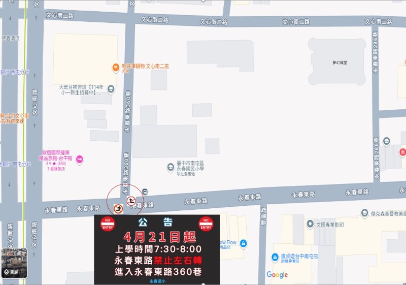 為維護學生上學安全,交通局訂於4月20日(星期日)於永春東路設置上學時間7:30-8:00「永春東路禁止左右轉進入永春東路360巷」禁制標誌,敬請家長配合4/21日起上學時間,汽機車勿由永春東路轉入永春東路360巷。