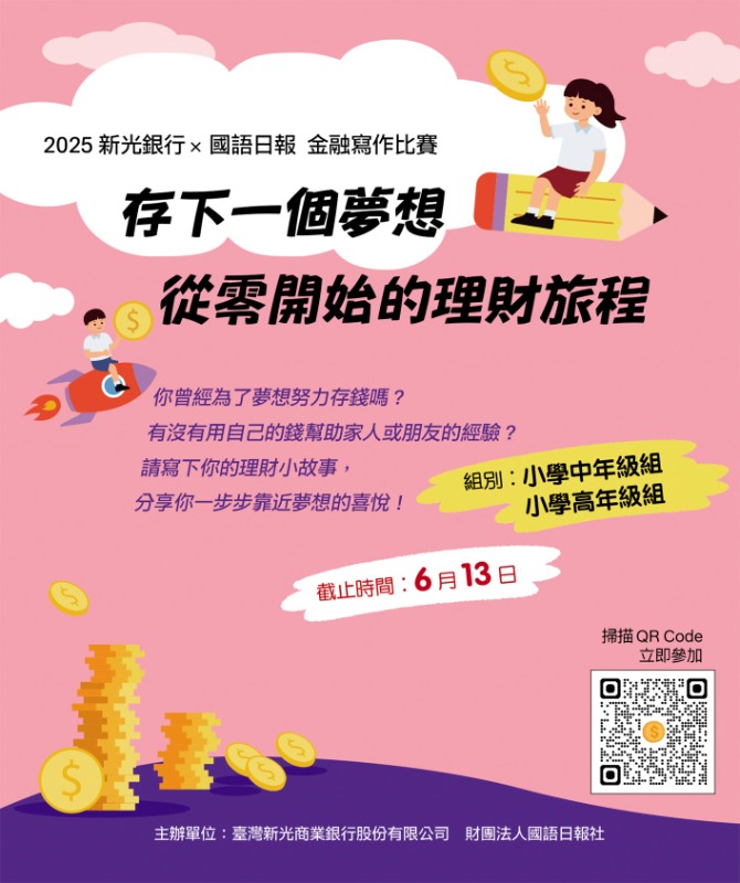 為提升兒童的財商素養,讓孩子了解金錢的價值與管理能力,本社與臺灣新光商業銀行共同舉辦「存下一個夢想 從零開始的理財旅程」徵文活動。 |