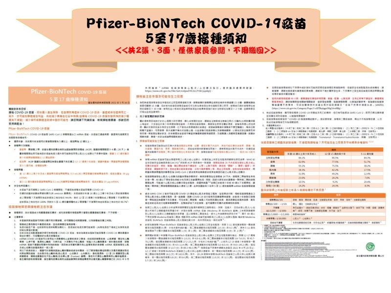 (一)Pfizer-BioNTech COVID-19疫苗 5-17歲接種須知(共2張,3面資料,提供家長詳閱討論,不用回收) ★★★Pfizer-BioNTech COVID-19疫苗 5-17歲接種須知及評估暨意願書(←請點閱)★★★