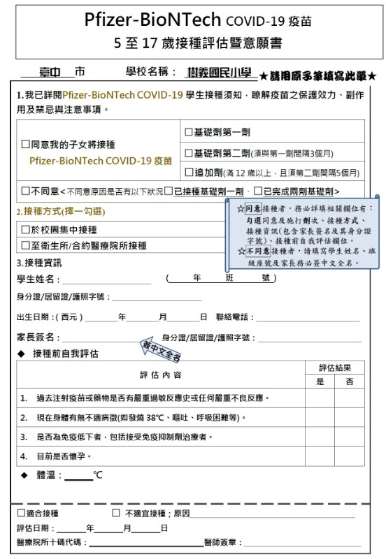 此發文內容包含: §Pfizer-BioNTech COVID-19疫苗施打年齡說明(臺中市醫療院所預約連結、預定開打日期) §本校預定於6/10(五)集中校內學童施打疫苗,疫苗紙本意願書請6/6(一)交回學校。 ☆☆意願書填寫注意事項☆☆ §小小疑惑解惑問題區: 🌟接種完COVID-19疫苗多久會有防護力!?(兩週) 🌟孩子請防疫假,無法拿到校內發下紙本怎麼辦?!(文末提供,自行下載) 🌟想帶孩子先去施打兒童劑型疫苗,還需要將意願書繳回嗎?!(家長填寫簽名後,請將回條繳回)。