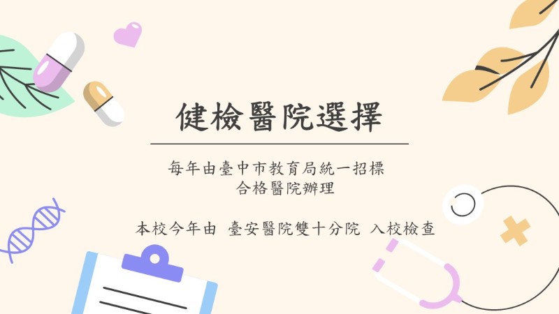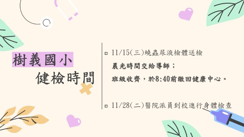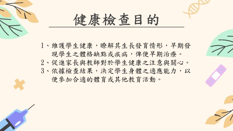★★理學健檢項目說明: ★檢查日期:11/28(二)早上8點開始 ★檢查時間:依各班安排時段前來 ★檢查前注意事項: 1、當天穿著運動服或或輕便服裝(二截式服裝),女生勿穿裙裝及褲襪。 2、長頭髮孩子,請務必綁頭髮露出頸部,以利脊柱檢查。 3、檢查前請確實潔牙,以利口腔檢查。 4、若非必要,請孩子們盡量不要請假。 ★檢查項目: