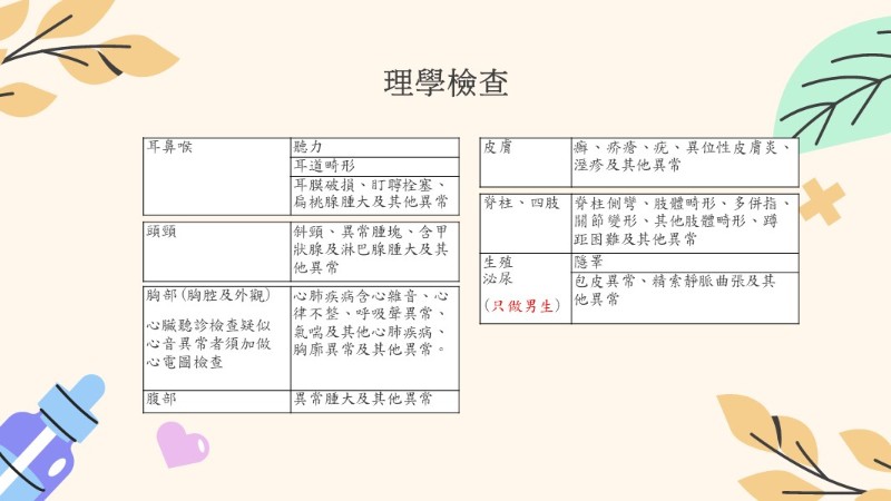 辨色力、聽力、頭頸及口腔、耳鼻喉、胸腹部、皮膚、脊柱及四肢、 生殖泌尿(限男性)。