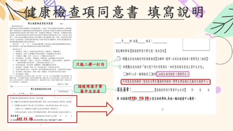 ★★學生健康檢查家長同意書,填寫注意事項: ★敬請使用原子筆勾選填寫此同意書,請勿塗改。 ★選項(1)同意、(2)不同意,請擇一勾選。 ★續上點,勾選(2)不同意,請依不同意項目進行勾選。 【若有不同意在校檢查,請家長自行帶至醫療院所檢查,並繳回正式報告至健康中心】 ★家長簽章,請使用原子筆簽中文全名。 ★此單張請於11/10(五)之前交回學校。