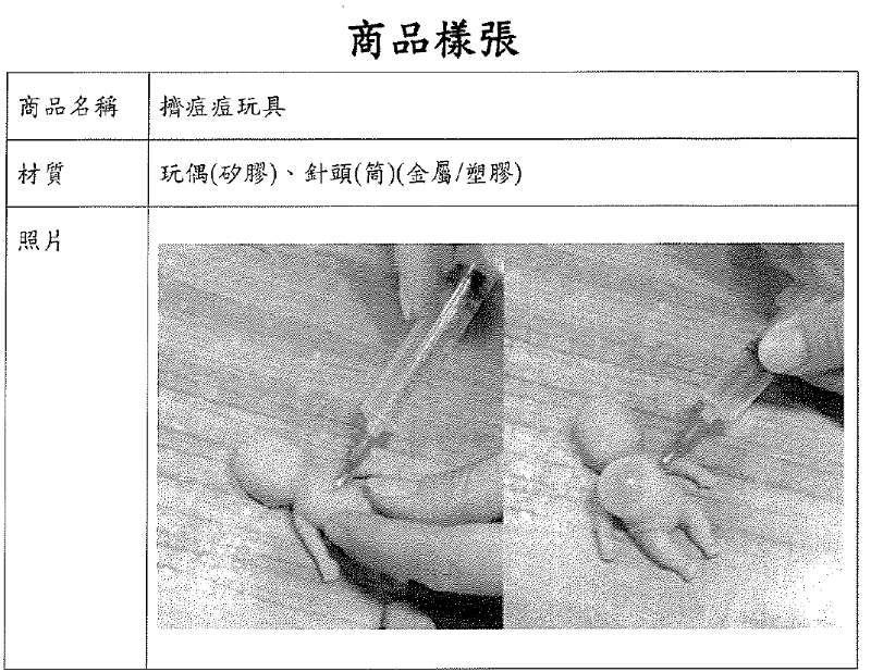 近期媒體關切針筒玩具(即擠痘痘玩具)之安全性,爰經標局就該商品檢驗相關規定,說明如下:(一)旨揭商品係矽膠材質玩偶及附有針頭(筒)之成套商品,屬經標局公告應施檢驗玩具商品範圍。(二)依國家標准CNS 4797-3「玩具安全-第3部:機械性及物理性」第4.7節規定,該商品依第5.9節(尖端試驗)測試時,不得含有危害尖端。如附有針頭(筒)者,即不符合前述規定,不得於市場銷售。 |