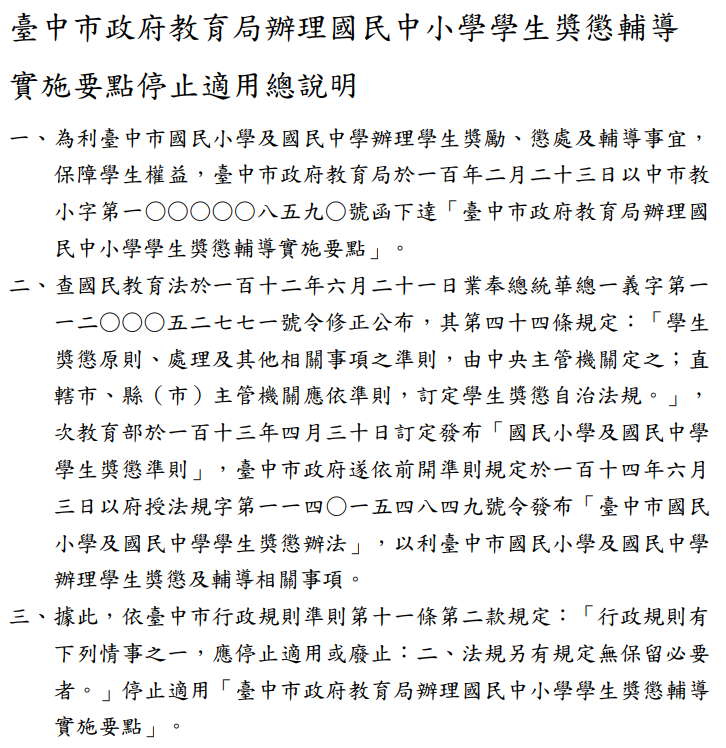 | 標題 | 轉知:「臺中市政府教育局辦理國民中小學學生獎懲輔導實施要點」自114年6月5日停止適用 |