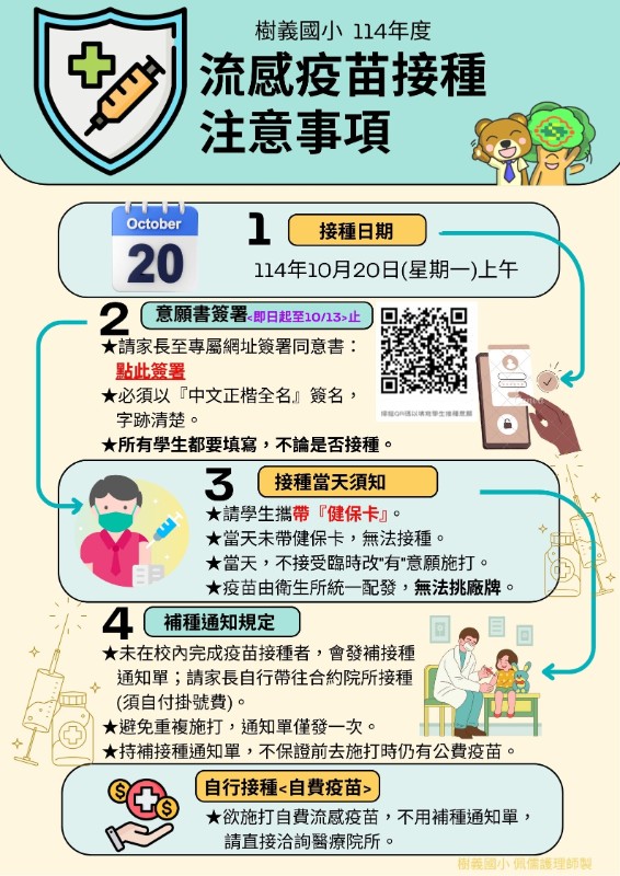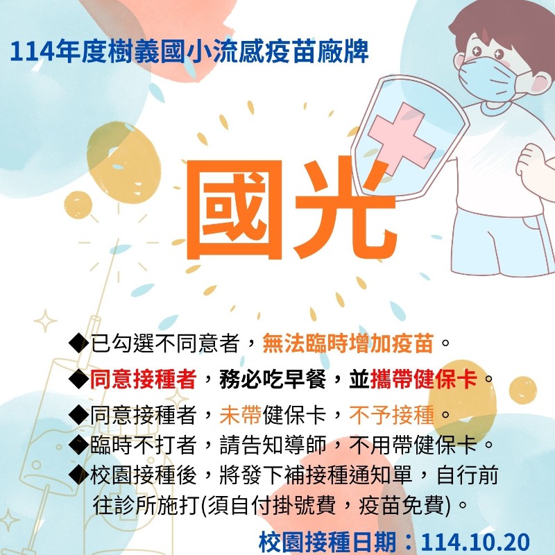 | 標題 | <公告>114年度校園流感疫苗施打訊息<請務必攜帶健保卡> |
