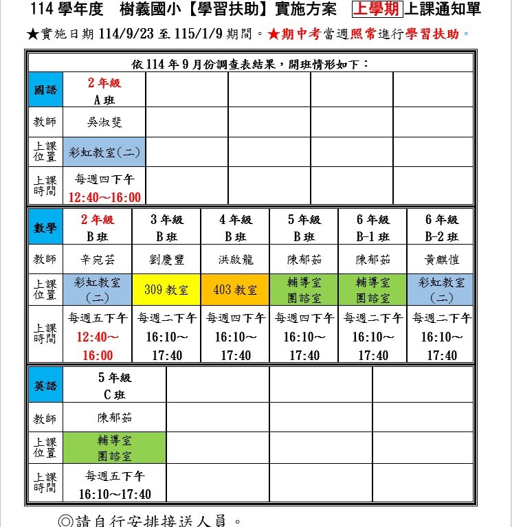 114學年度上學期學習扶助 上課資訊及學生名單