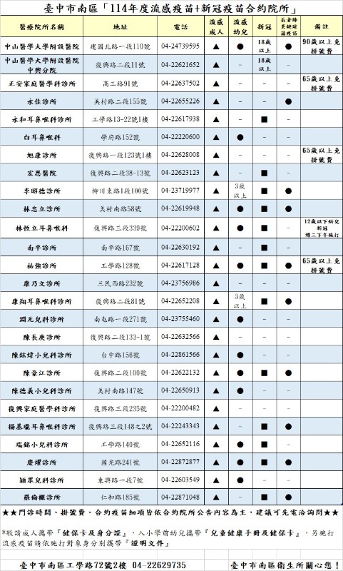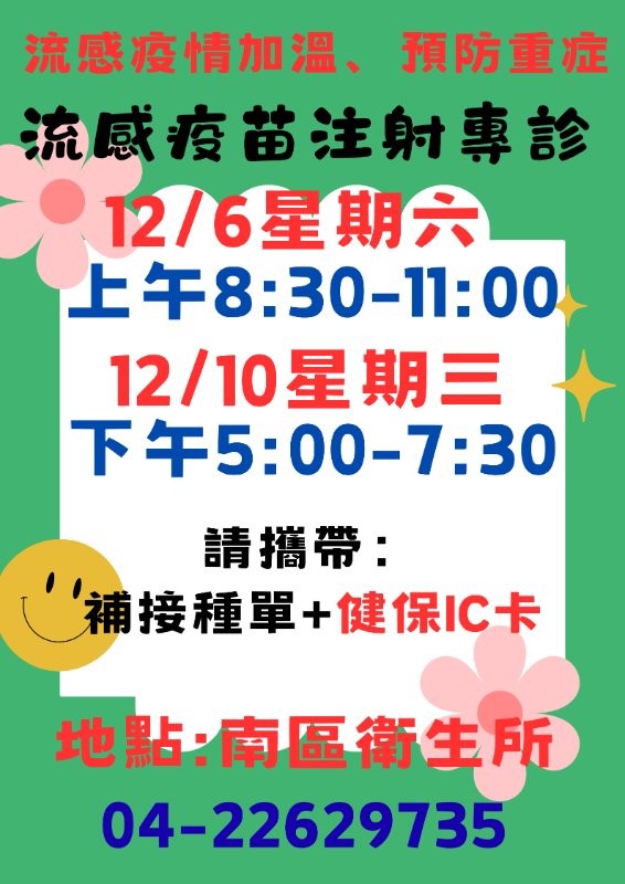 | 標題 | <公告>114流感疫苗接種後注意事項<南區衛生所12/6上午、12/10下午專診施打> |