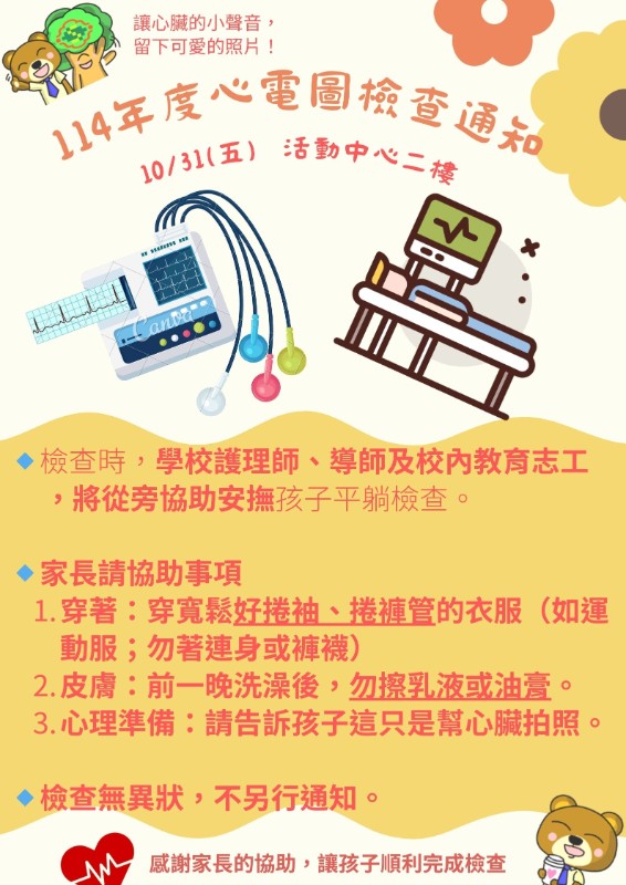 ◆檢查時間:10/31(五) 上午◆檢查地點:活動中心二樓◆檢查說明: ◇利用吸盤式電極記錄心臟電流,不打針、不會痛、不會破皮。 ◇孩子會覺得皮膚被輕輕吸住或冰冰的,是正常的。 ◇檢查時,學校護理師、導師及校內教育志工的媽媽,將從旁協助安撫孩子平躺檢查3-5分鐘。◆檢查前小提醒: ◇穿著:穿寬鬆好捲袖、捲褲管的兩截衣服(如運動服;勿著連身或褲襪) ◇皮膚:前一晚洗澡後,勿擦乳液或油膏。 ◇心理準備:請告訴孩子這只是幫心臟拍個照。◆檢查後: ◇若未接獲通知,即心電圖未發現異常。