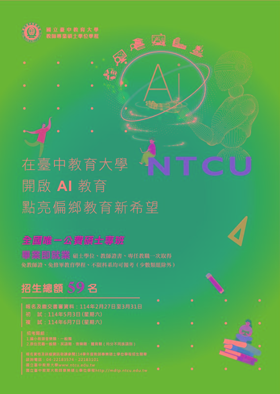 國立臺中教育大學教師專業碩士學位學程114學年度招生海報電子檔1份,請參考。