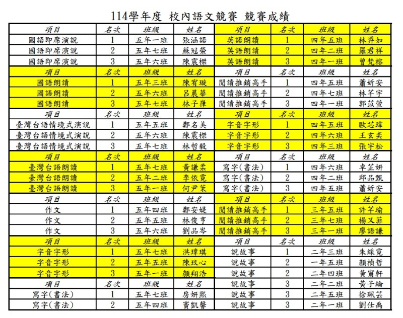 114學年度校內語文競賽成績公告