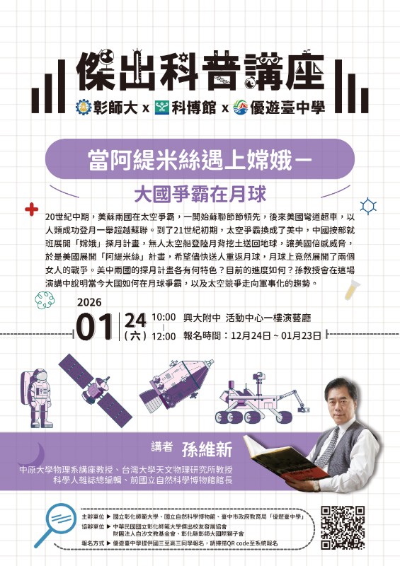 本局114學年度開始與國立彰化師範大學、國立自然科學博物館合作,共同辦理12場傑出科普講座,為擴大學習資源之運用,推廣科普教育,特開放教師、民眾共同參與。 |