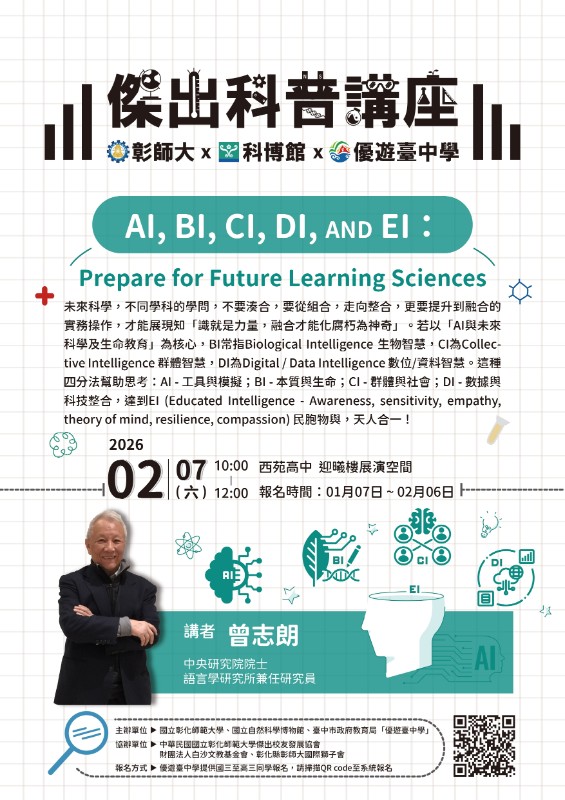 本局114學年度開始與國立彰化師範大學、國立自然科學博物館合作,共同辦理12場傑出科普講座,為擴大學習資源之運用,推廣科普教育,特開放教師、民眾共同參與。 |