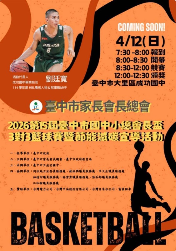 🏀臺中市家長會長總會2026總會長盃3對3籃球錦標賽,將於115.4.12(日)在成功國中舉辦,邀請愛好籃球的國中、國小學生參加,一起來以球會友、切磋球技! https://ckjh.tc.edu.tw/p/406-1147-581975,r73.php?Lang=zh-tw