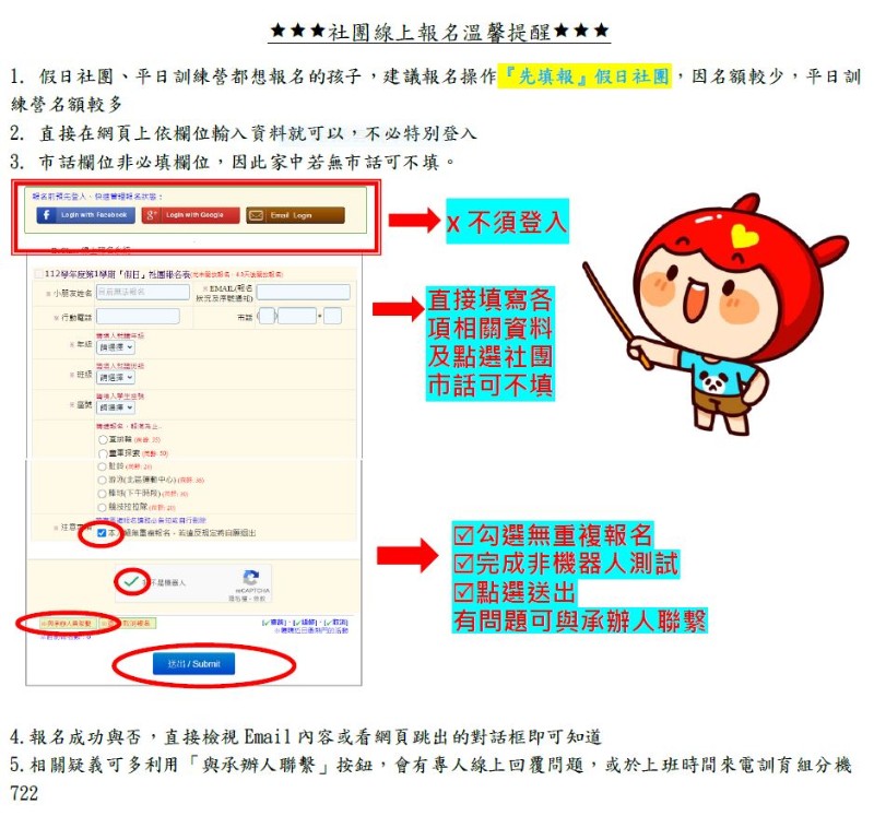 (1)假日、平日都想報名的孩子,建議報名操作『先填報』假日社團,因假日社團名額較少,平日社團的名額較多。 (2)直接在網頁上依欄位輸入資料就可以,不必特別登入,市話欄位非必填欄位。 (3)假日社團設有候補5名的名額。每個學生可以同時有一個正式名額及一個候補名額。 (3)報名成功與否,直接檢視Email內容或看網頁跳出的對話框即可知道。 (4)如有任何疑問,歡迎利用報名表網頁下方「與承辦人聯繫」按鈕,會有專人在線上回答問題,或於上班時間撥打訓育組分機722。 (5)詳細操作方式請參考圖示。