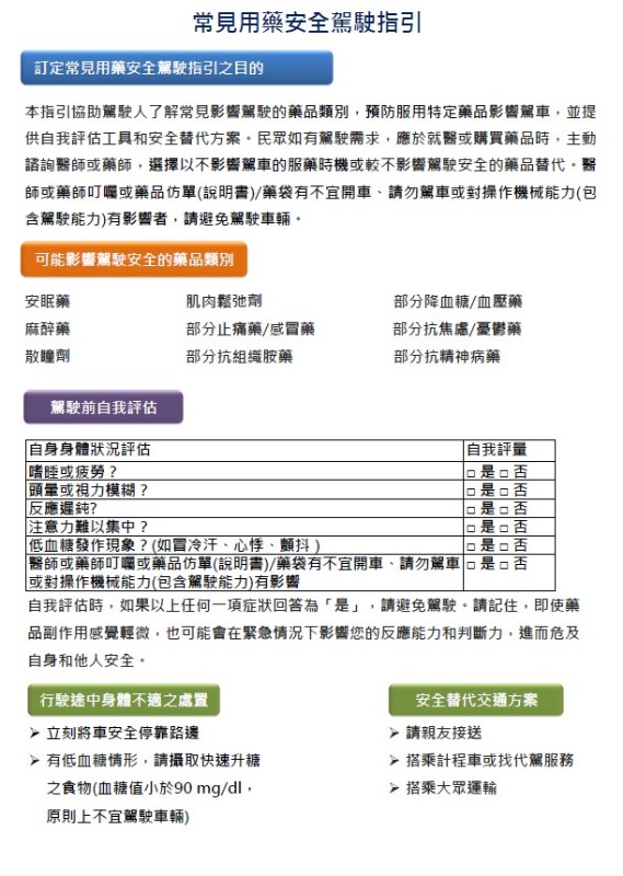如題, 交通部公路局鑑於社會各界關注駕駛人服用藥物後可能影響駕車安全課題,就國人常用之藥品,徵詢專家意見制定旨揭指引。 本指引已置於交通部168交通安全入口網/教材文宣/懶人包/駕駛一定「藥」知道,供道安宣導及民眾下載利用。