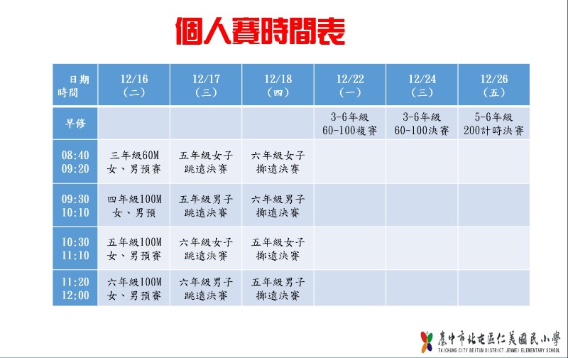 114學年度校慶運動會個人賽賽程安排及徑賽分組