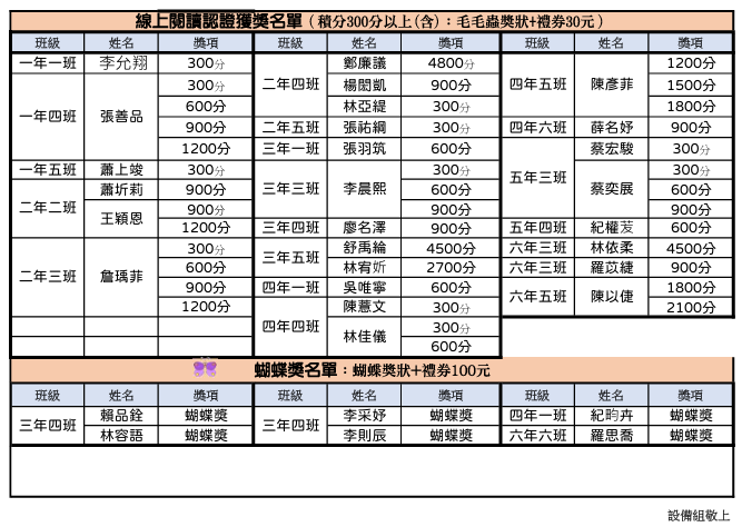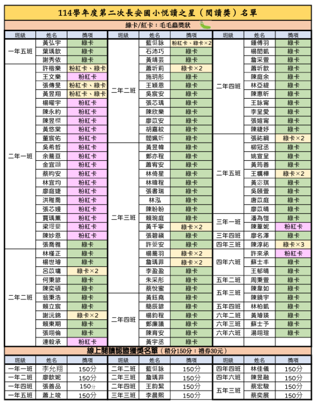 114學年度第二次長安國小悅讀之星(閱讀獎),恭喜獲獎同學~