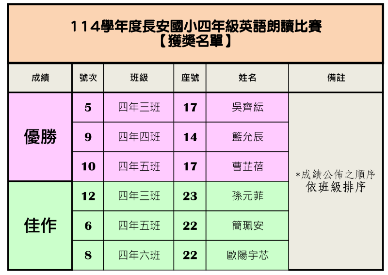 114學年度長安國小四年級英語朗讀比賽 獲獎名單~恭喜