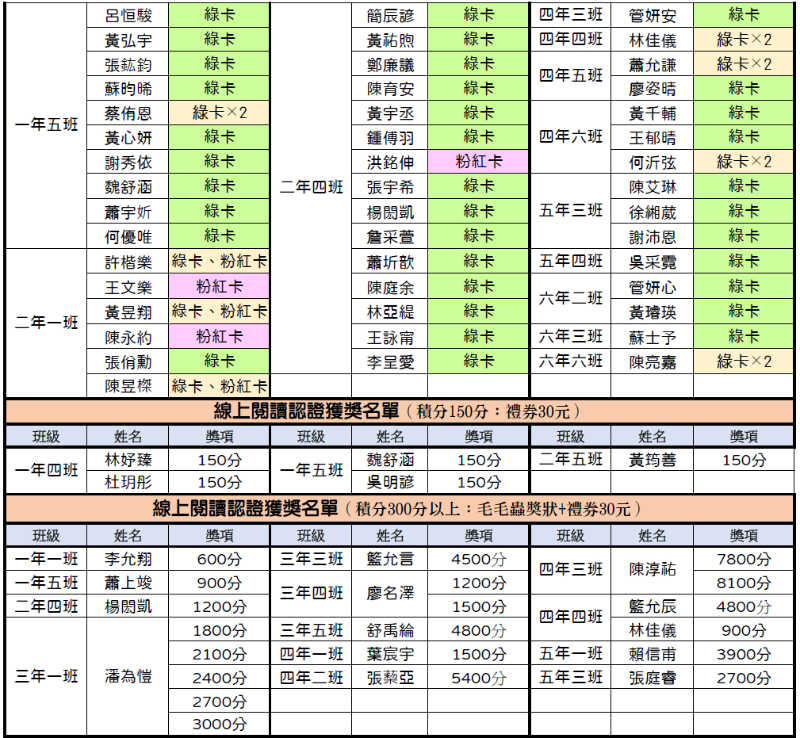 114學年度第四次長安國小悅讀之星(閱讀獎),恭喜獲獎同學~