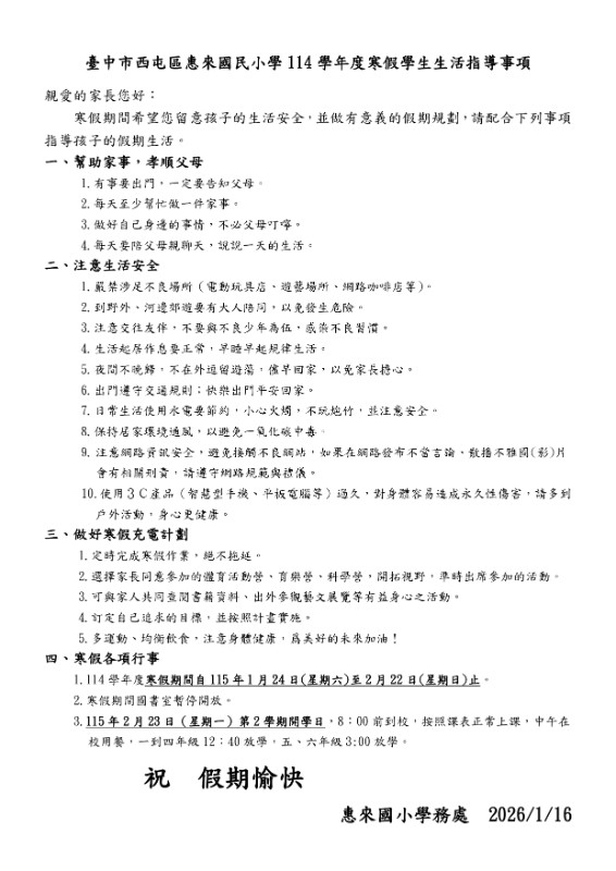 | 標題 | 「寒假生活指導事項」「113學年度第1學期休業式 及 第2學期開學日 作息時間表」 |