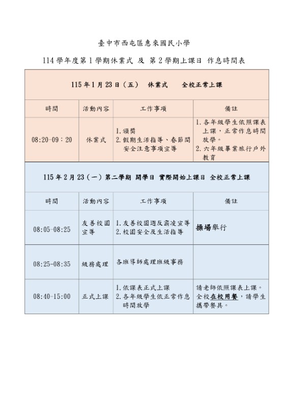 「寒假生活指導事項」 及 「113學年度第1學期休業式 及 第2學期開學日 作息時間表」共參