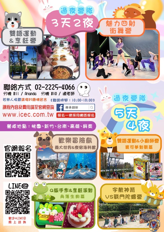 傳承創新文教有限公司(冬夏令營) 過夜營隊t承辦單位:承新國際旅行社 非過夜營區地點:台北科技大學 板橋致理科大 台北南華高中