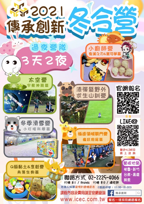 一、傳承創新文教冬令營,將於110年1月21日~2月10日,舉辦2021寒假兒童文化冬令營活動,共計約22個梯次。 二、活動內容計:造型美食烘培營、宇航神箭科學營、雙語運動營、Q版創意黏土營、魅力四射街舞營、漆彈暨野外求生山訓營、…等。 三、活動對象為目前就讀小一~小六的小朋友,各營隊年級限制有所不同。 四、活動地點:桃園、新竹、台南、台北科技大學、台北南華高中、新北致裡科大。 五、2021寒假兒童夏令營活動網址為www.icec.com.tw,歡迎線上報名。 六、敬請貴單位發佈活動訊息於學校網頁及發放簡章至各班級等事宜。 七、報名活動及繳費,不需經由貴單位,統一由傳承創新文教負責辦理。 八、文教電子信箱為 amanda@icec.com.tw,歡迎來信 索取附件之簡章(A4雙面),註明:學校名稱、收件人姓名 及所屬單位、電話、地址及全校人數,簡章將會寄到貴校。