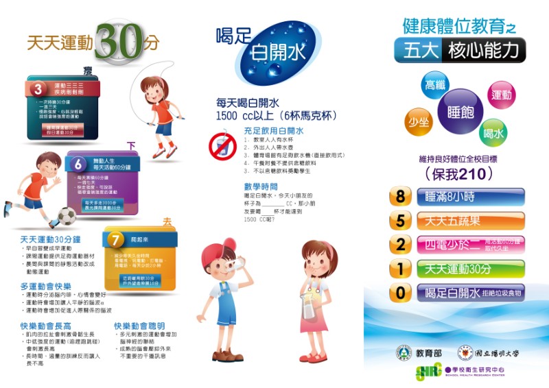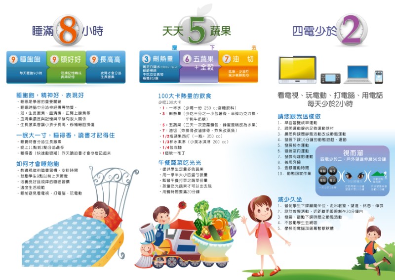 健康體位核心能力85210 睡飽8小時、天天5蔬果、四電少於2、天天運動30分鐘、喝足白開水 「85210」健康成長密碼如何執行呢? 「8」是每天睡足八小時,充足的睡眠不只讓學童學習成效佳,也有足夠的生長激素促進健康生長; 「5」是每日五蔬果,攝取足量蔬果不僅提供學童成長所需的營養素,也養成學童注重均衡飲食及良好的生活習慣; 「2」是每日觀看 3C 螢幕時間少於 2 小時,久坐只動眼球的行為會讓學童喪失「動」能; 「1」是每 1 日運動至少 30 分鐘,養成動態的生活習慣,吃與動的平衡來促進健康成長; 「0」是零糖飲足喝水, 現代學童飲食中添加糖無所不在,過量添加糖的攝取導致肥胖也影響學童的生長,需注意養成學童足夠飲水量,避免過量添加糖攝取的飲食習慣。
