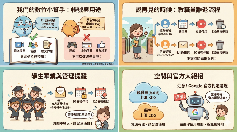 資訊組補充說明: 使用規範中,1.2明訂「不得使用於校務行政、教育學習用途之外例如社群服務、線上金融服務或遊戲網站綁定等)」,且3.2明訂「教職員離退、學生畢業或轉學未符合前述服務對象,每年 9 月起寄發通知信 90 日後停權、 120 日後刪除。」,敬請切勿綁定「@tc.edu.tw」或「@st.tc.edu.tw」帳號於非教育學習用途,以免帳號刪除後,影響自身權益。