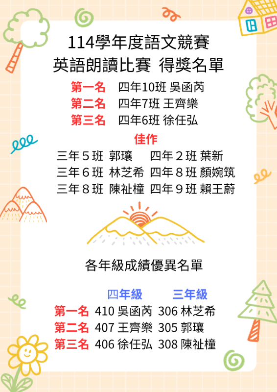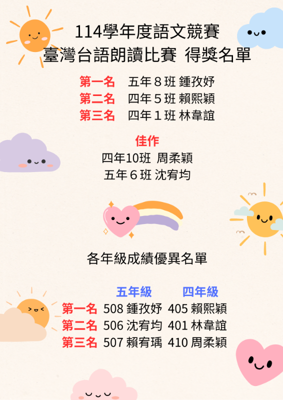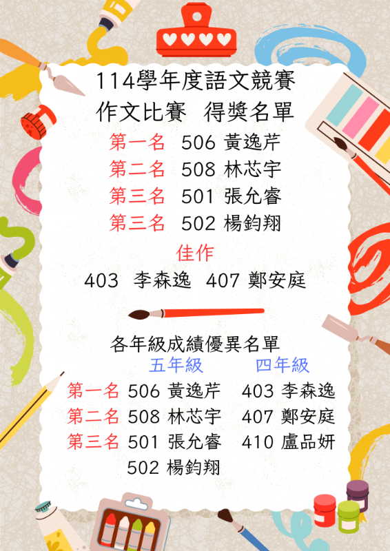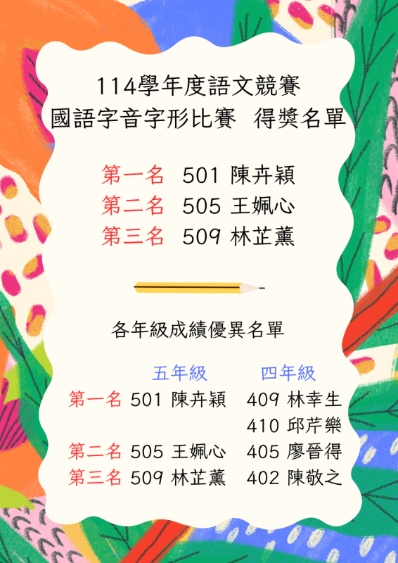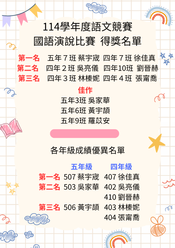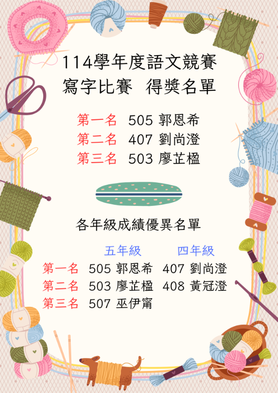 1. 恭喜以上得獎同學,獎項近期於學生朝會頒發。 2. 因應市賽校內選才,及考量學生認真準備,除原本的不分年級排名之外,另外增設分年級的成績優異證明。